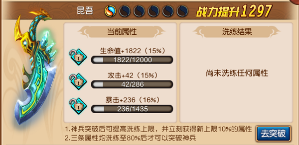 每种神兵的基础属性值都不同,可以通过洗炼对基础属性值进行提升。