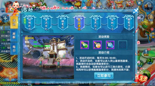 灵山温泉:终于能缓一缓手指间的跳跃了,在这里你可以和其他玩家聊聊天,玩玩三消小游戏,享受这安静而短暂的时光,还能获得不少的温泉积分,若是想在这闹事,劝你还是把这点小心思收起来,这里可是禁止动手的!