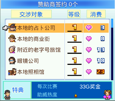 利用研究点数签约的赞助商会提供给球队大量资金,签约不同的赞助商还会使球队获得不同的效果,包括获得球迷助威热度降低一些活动比如训练、地区活动的成本等。