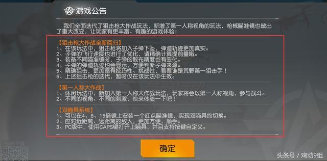 在这次更新中除了增加了两个新的休闲游戏模式,还正式更新了双瞄具系统。拥有了这个系统小伙伴再也不用为瞄准镜占背包空间的问题而苦恼了,也不用为了应对不同距离的作战不断的更换瞄准镜了。