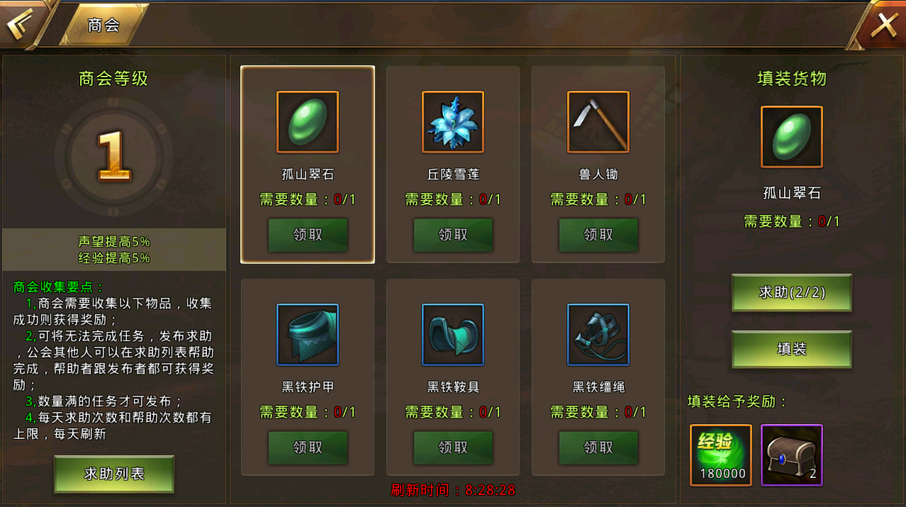 温馨小贴士:每天最多能参与6次商会收集!而且在商会界面最下面有物品的刷新时间倒计时,现在有些物品没有不要太担心,等刷新之后再来看看可能问题就迎刃而解啦!