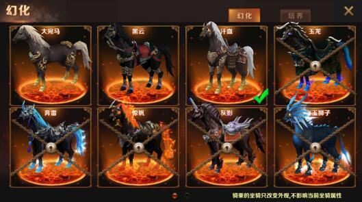 坐骑幻化后,会改变外观,使坐骑更加的酷炫。当坐骑等级达到10级就可以突破,突破后即可获得新的坐骑。