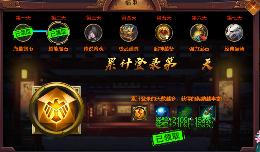 3. 七日登入:服务器开放以后登入就可以领取的奖励,跟签到有些类似。但是奖励只可以领取7次(对玩家有极大的提升)