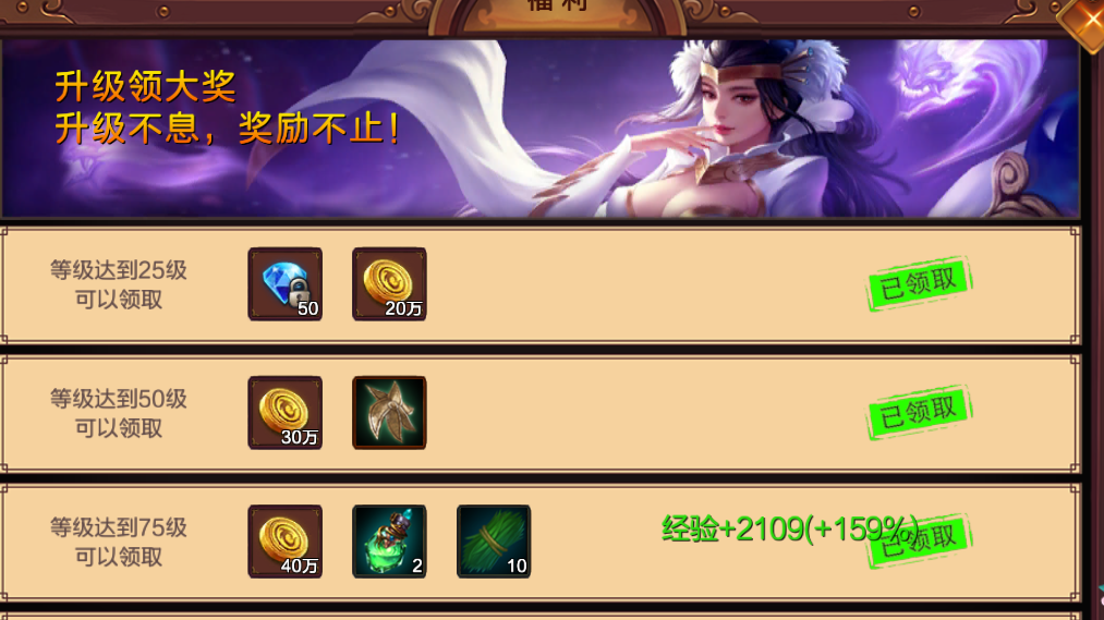 4.等级奖励:对积极升级的玩家发放的奖励,玩家没达到一定等级就可以领取。奖励物品比较丰富。