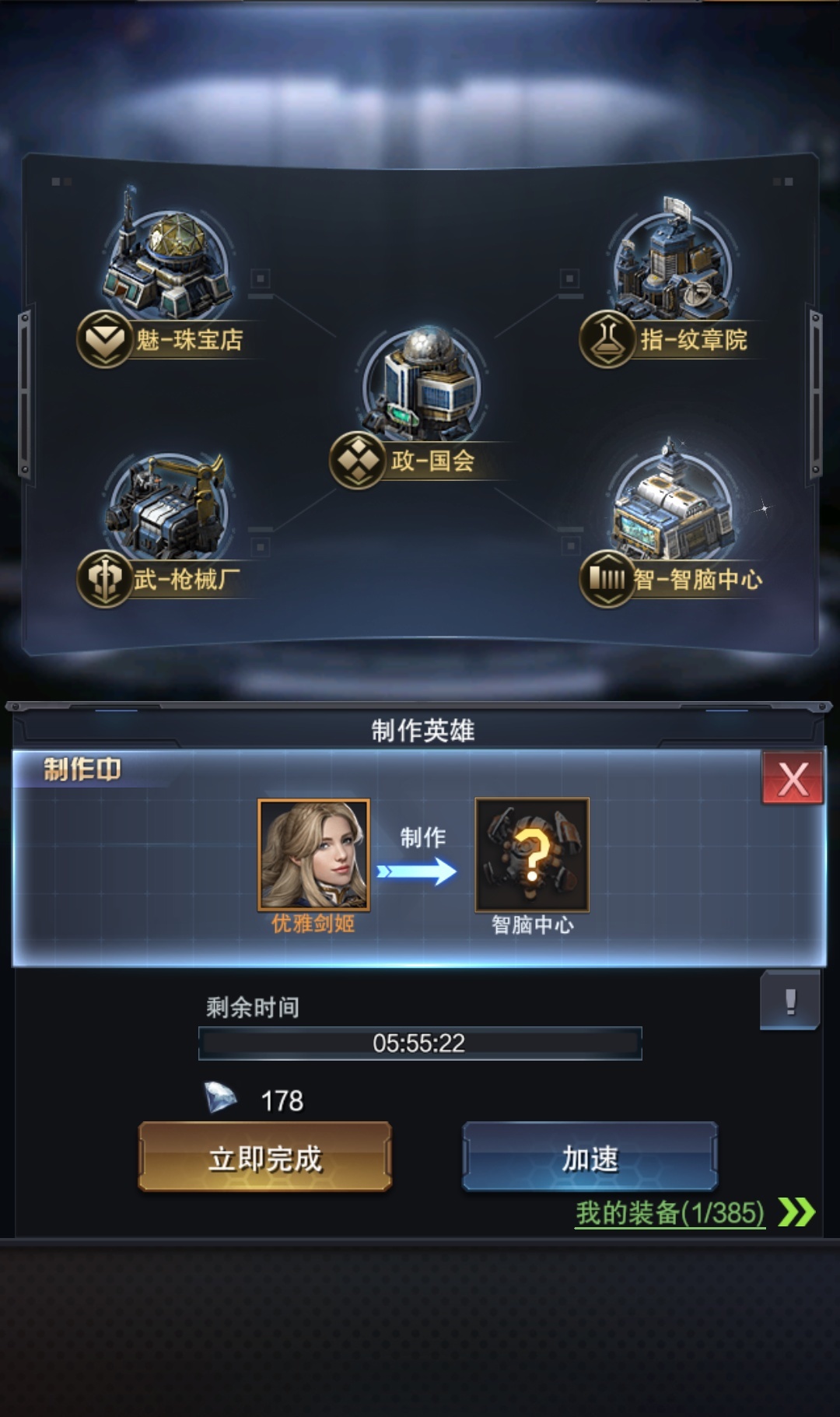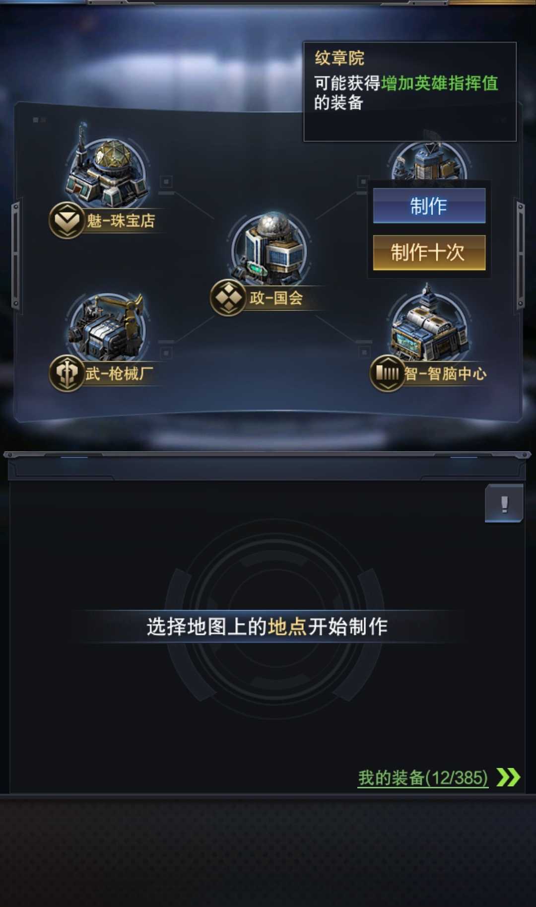 位于基地内的器械所是我们获取各个品质、类型装备的一大途径,其中就能获取橙阶的魅力型、武力型、政务型、指挥型和智力型装备;只需将魅力值大于90的英雄派遣到器械所,等待其制作完成,则有几率能制作出对应的橙阶装备;