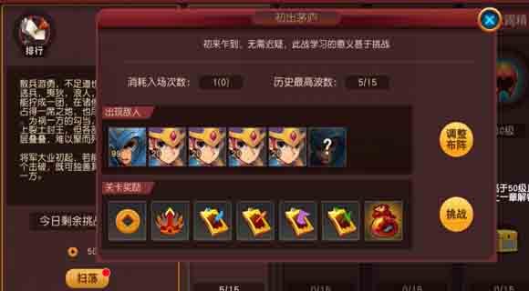在挑战“兵临城下”前,我们需要根据敌方的武将和阵法信息来调整我方的布阵,尽量选择攻击技能为范围伤害的武将会大大降低通关的难度。
