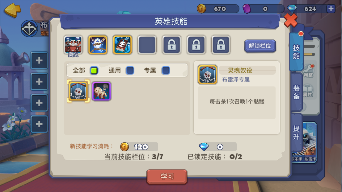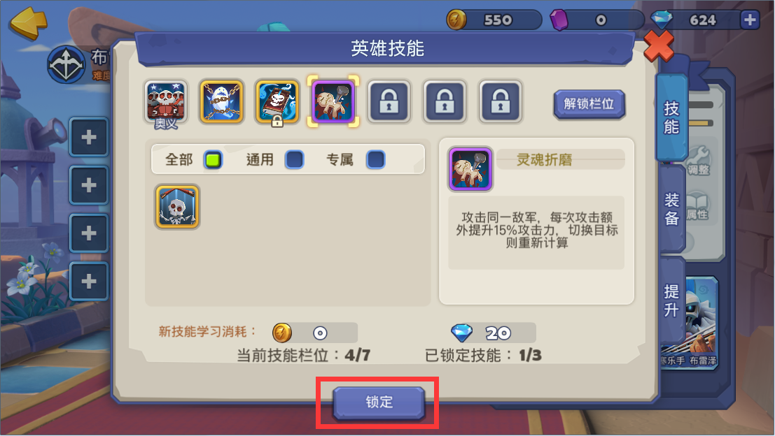 每个英雄最多可以学习6个技能,其中3个技能槽处于锁定状态,解锁后可填充新的技能。