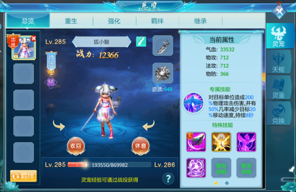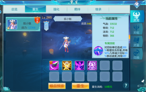 1.灵宠可以进行重生,重生后被动技能及资质会被随机重置。