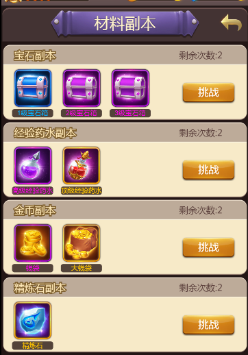 有宝石副本、经验药水副本、金币副本、精炼石副本,