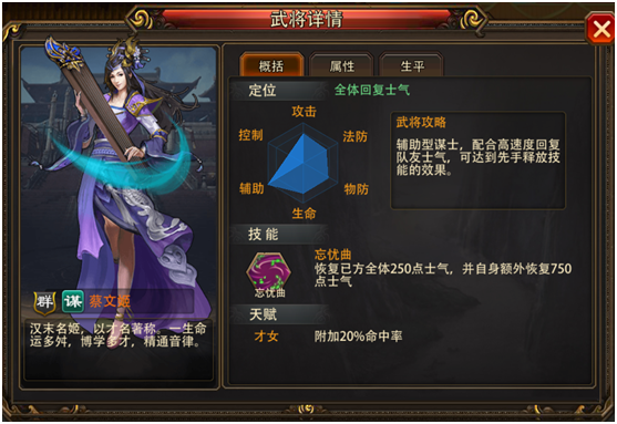 小编今天给大家带来《鏖战三国》蔡文姬的详细介绍,让你对蔡文姬这张卡牌更加了解,多多关注我们《鏖战三国》专区,小编会带来更多的攻略。