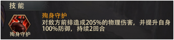 对敌方前排造成205%的物理伤害,并提升自身100%防御,持续2回合