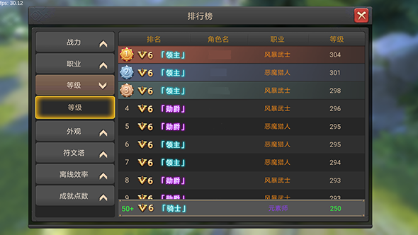 2.分为战力榜、职业榜、等级榜、外观榜、符文塔、离线效率、成就点数;
