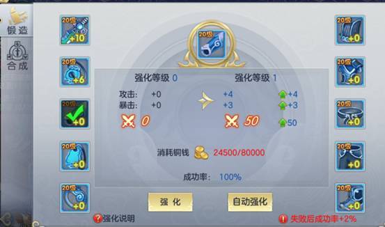 强化:一般通过强化功能对装备进行强化之后,装备的战斗力都会有一个小小的飞跃。而随着游戏的成熟度越来越高,以及优化越来越碉堡,现今,玩家在游戏中将装备强化提升到15级之后,战斗力将会达到一个爆炸式的提升,而这提升,绝对超出玩家的预料之外。所以,对于追求高战力的玩家来说,这必是一个值得嗨皮的消息!强化成功该部位+1,如失败则-1;强化等级越高,强化成功率越低,所需的强化材料也越多。如高强化等级部位不想因强化失败而掉级,可以使用强化保护符,使用保护符后强化失败不会掉级。强化石及强化保护符获取的途径:击杀BOSS,商城购买,装备副本,签到。
