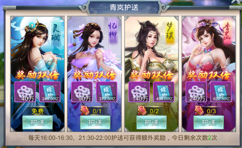 1、青岚护送有4个仙女进行选择护送,护送不同仙女奖励也有不同;