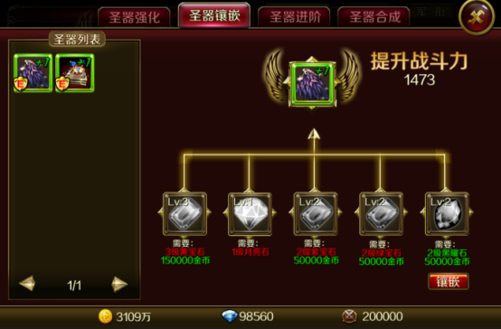 3:圣器同样也能够镶嵌宝石,也是增加属性和提升战斗力。圣器上必须要镶嵌相应等级的宝石,能镶嵌到圣器的宝石共分五种:黄宝石(普通攻击),月亮石(普通防御)、绿宝石(技能攻击)紫宝石(技能防御)黑曜石(破甲伤害)