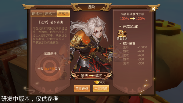 每一组进阶任务包含三个历练任务,玩家需要依次完成历练一、二、三的目标后即可完成一次进阶。历练一、二通常为击杀小怪获得一定数量的物品,难度不高。