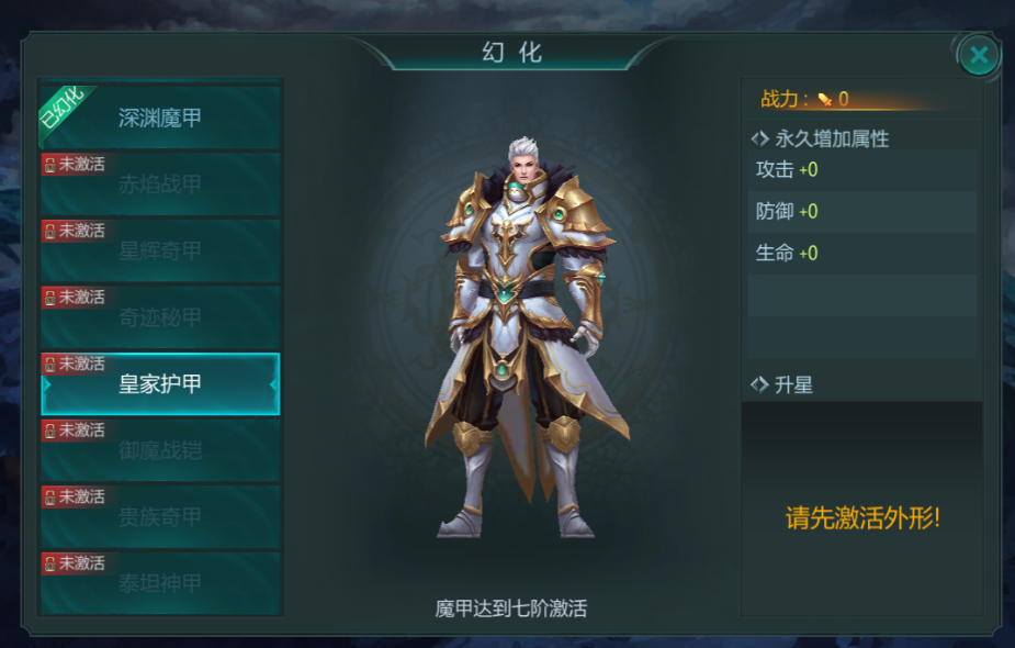 游戏角色可穿戴。可通过收集对应的升级道具或者直接花费绑钻和钻石来对当前所穿戴的魔甲进行升级。升级后,增加游戏角色对应的属性,并且获得新的魔甲形象,可以直接在场景中展示出来。