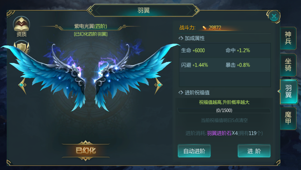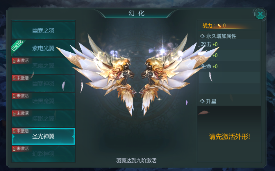 玩家可以随时选择展示自己已经获得的羽翼形象。同时羽翼也可以进行资质的培养,直接使用道具来增加羽翼当前的属性。
