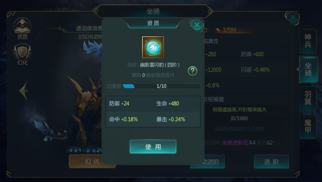 同时坐骑也可以进行资质的培养,直接使用道具来增加坐骑当前的属性。