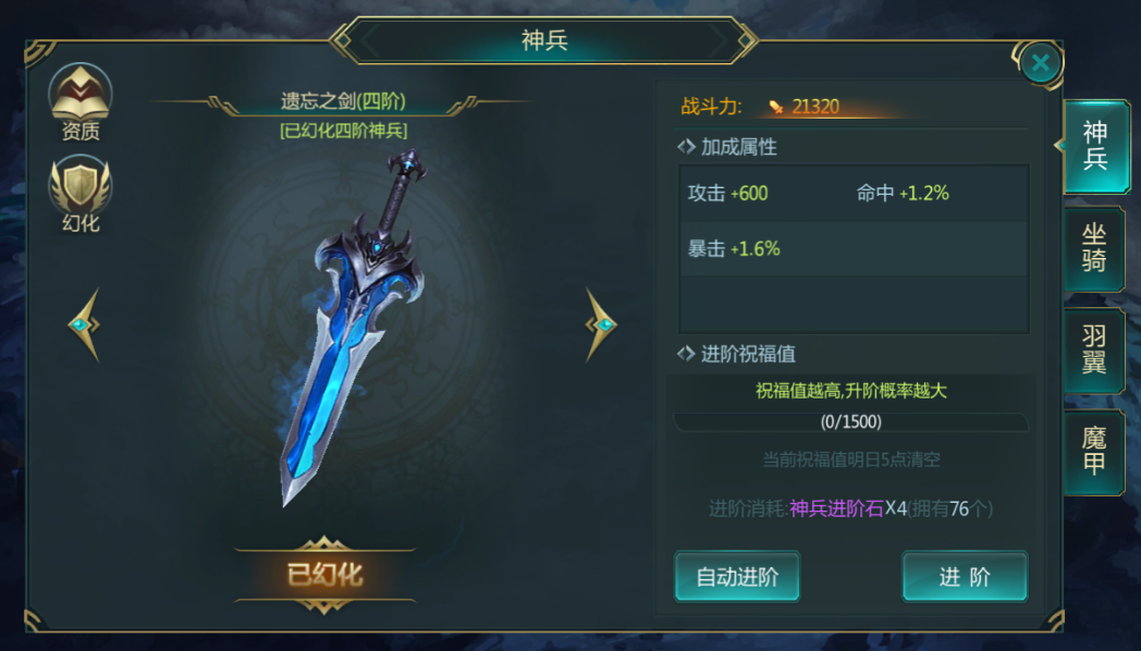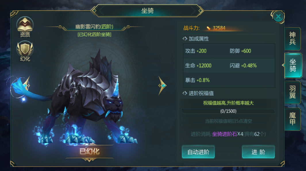 游戏角色可以骑乘的坐骑。可通过收集对应的升级道具或者直接花费绑钻和钻石来对当前所穿戴的神兵进行升级。升级后,增加游戏角色对应的属性,并且获得新的坐骑形象,可以直接在场景中展示出来。