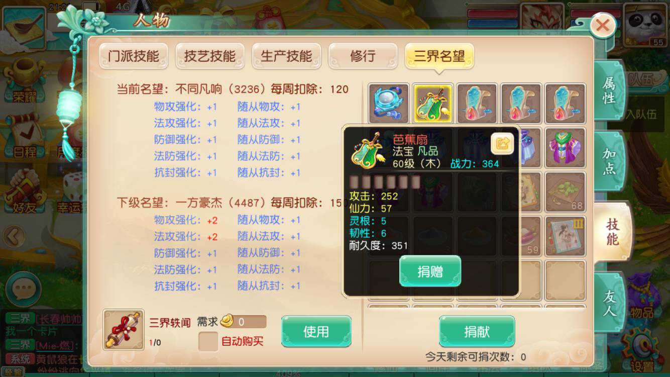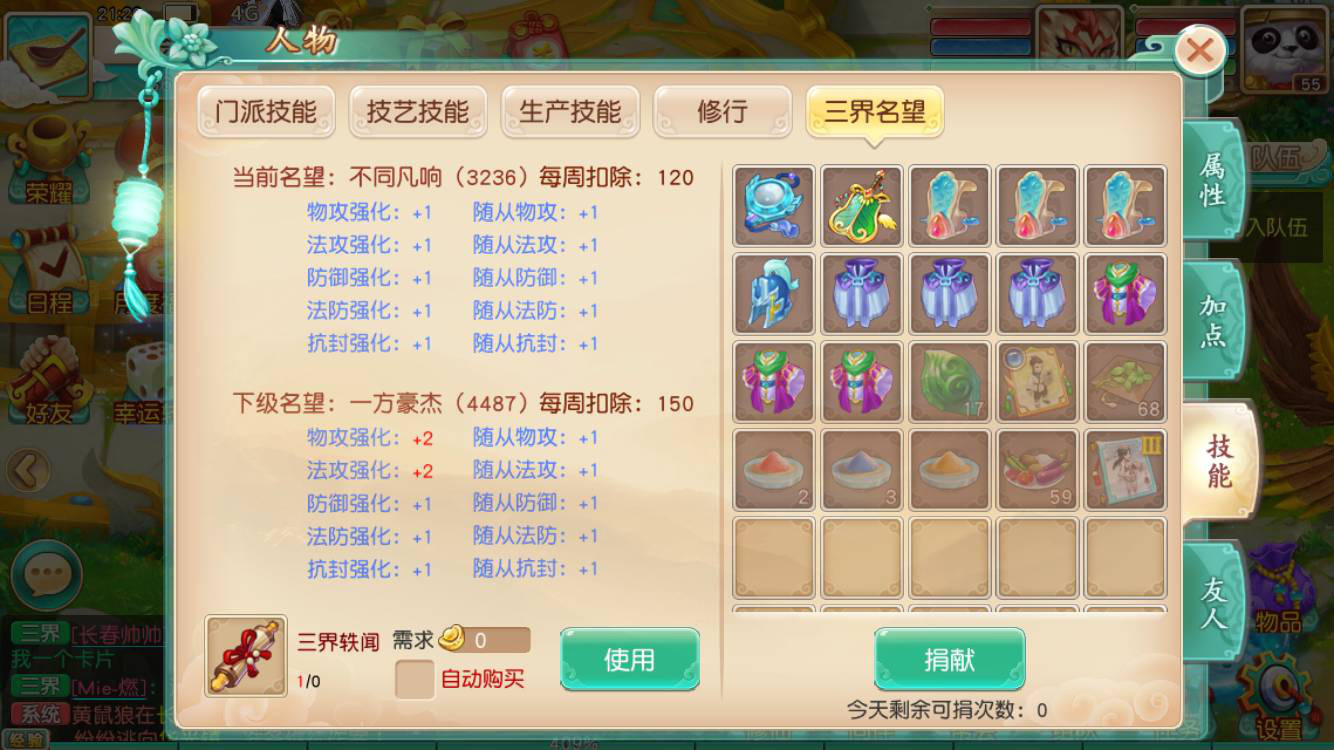 2、点击头像-技能-三界声望,然后就可以捐装备啦,把平时打到的用不到的装备捐了吧,装备等级越高声望加的越多;