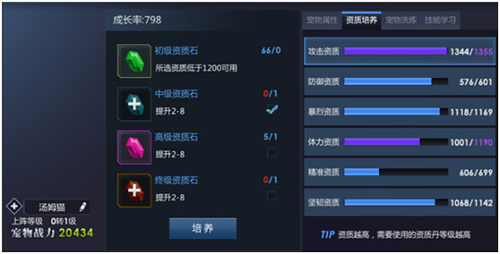 每只宠物都有6条资质属性,包括攻击,防御,暴烈,体力,精准和坚韧,提升资质需要消耗资质石,6种属性提升所需资质石通用。