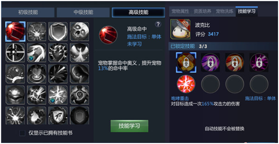 每只宠物都可以学宠物技能,分为初级、中级、高级三个级别。点击左侧技能书学习技能,但学习技能时,新技能有一定几率覆盖掉原有技能(玩家可用技能锁定石锁定原技能,可避免被新技能覆盖),每个宠物最多可同时锁定3个技能。一只宠物最多可拥有8个技能。