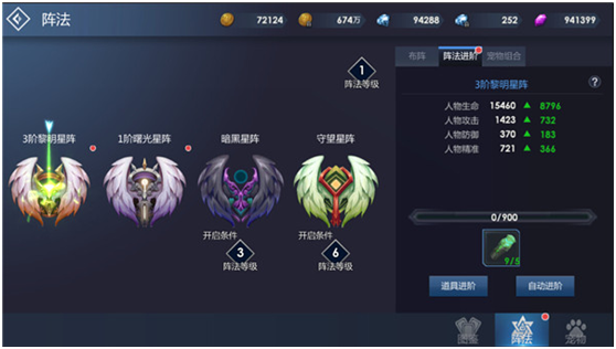 阵法进阶增加人物的属性,阵法等级随着已开放的星阵阶级提高而提高。提高阵法等级后可开启新的星阵。
