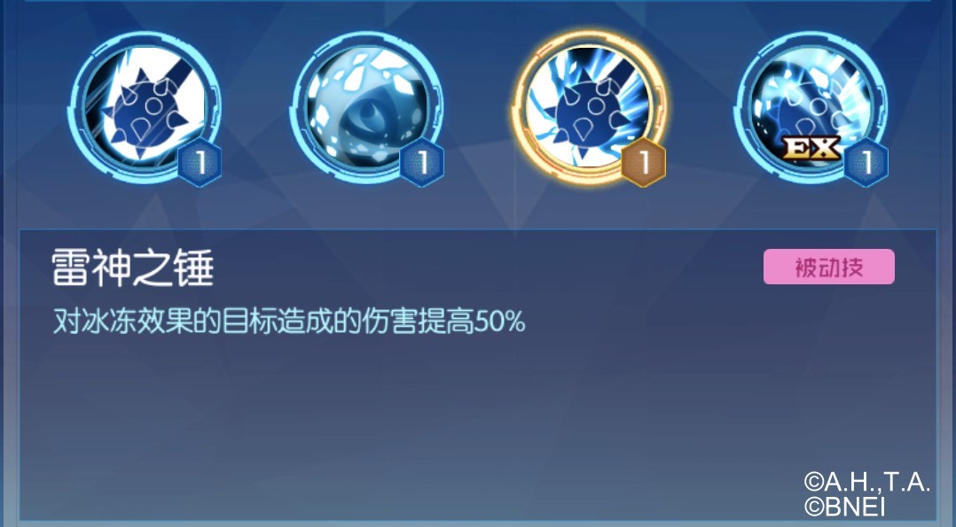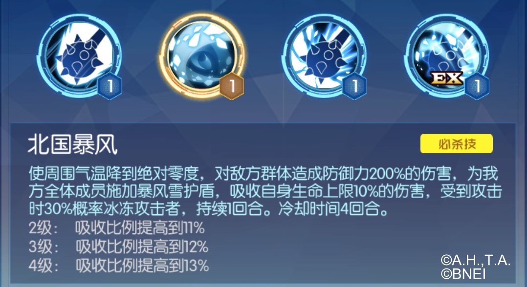群体攻击技能,可以攻击全体敌方数码宝贝,攻击强度也是由维京兽的防御力决定的。并且在攻击敌方的同时,为友方数码宝贝增加护盾,最多可以吸收10%的伤害,以及有30%的概率冰冻攻击者。这个技能给予了维京兽群体攻击的能力。而且重要的是可以为队友增加护盾和冰冻攻击者,也就是说在队友遭到攻击的时候,也有可能制造冰冻效果,这使得敌方被冰冻的可能性增大,从而利于维京兽被动技能的发动以造成更多伤害。