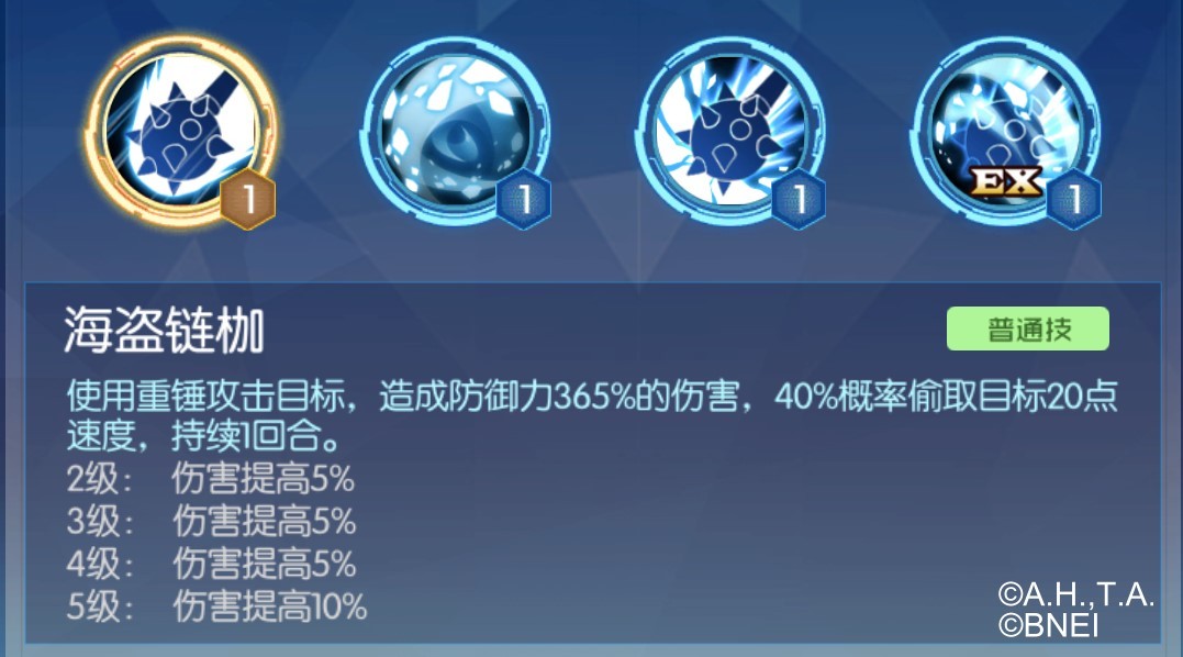普通攻击,值得注意的是,该攻击的数值由防御力决定,这使得维京兽防御力越高普通攻击越强。同时,这个攻击有40%概率夺取对方的速度,配合EX技和被动技可以造成更高的伤害。