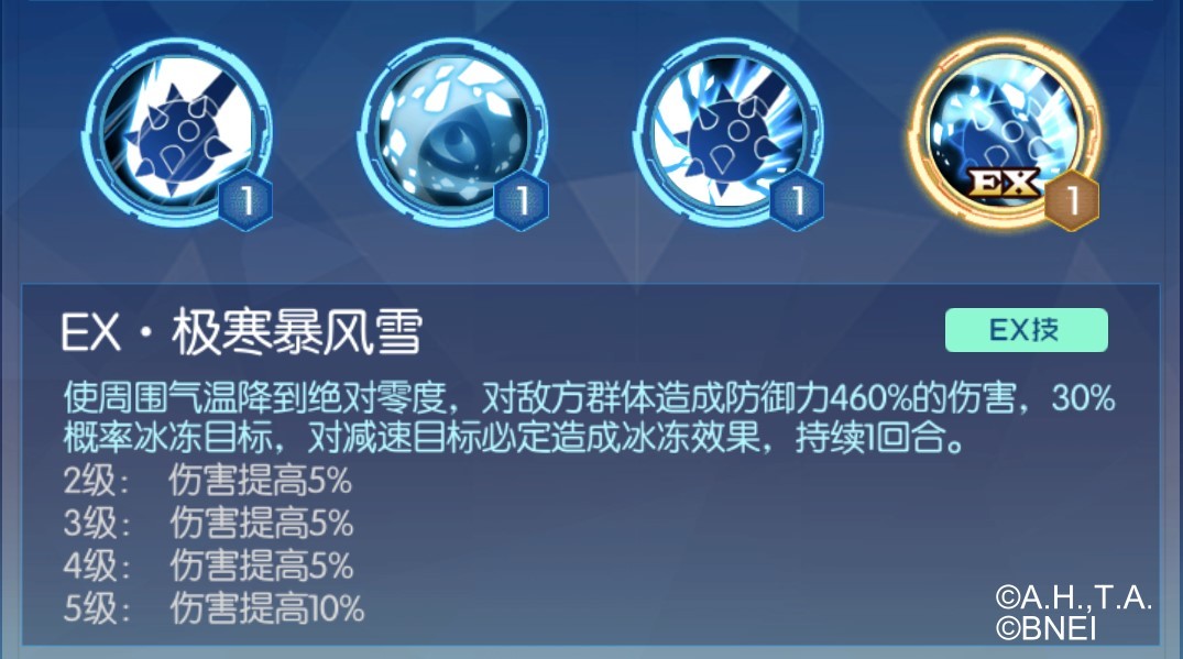 EX技能,攻击敌方全体,有30%概率冰冻敌方。配合使敌方减速的【海盗链枷】这个技能,可以造成更多的冰冻效果,是对敌方强有力的控制。对敌方的控制可以在一定程度上提高友方的生存可能性,并且维京兽自身具有不错的生存能力,因此维京兽可以和高攻击但生存能力略差的数码宝贝组合,提高它们的生存可能性以扩大它们的输出。此外,维京兽也可以和其他具有控制能力的数码宝贝配合,强化控制。