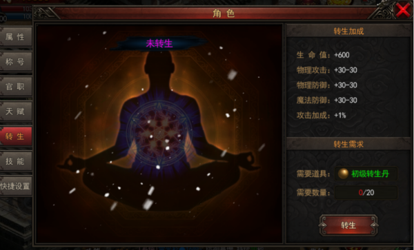 每次转生都可获得更多的各项属性加成,极大地提升角色的战斗力。转生需要消耗转生转生丹,可以通过活动、礼包、商城等获取。