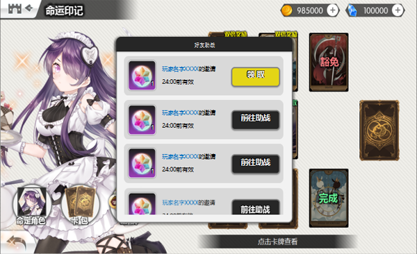 若好友已经帮忙完成助战,卡牌将会提示“可领取”,此界面不再出现邀请好友框,