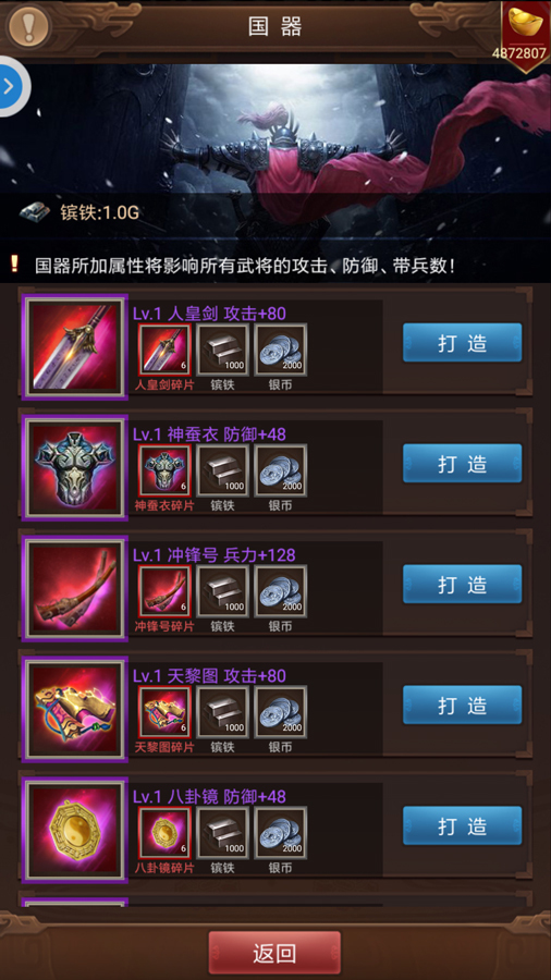 3.获得一个国器碎片后也可选择花费一定元宝购买剩余的5个国器碎片。