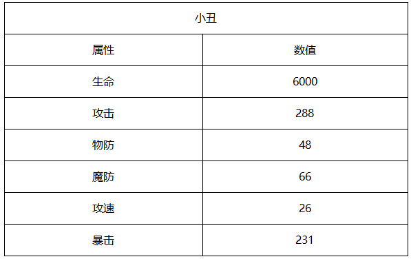 小丑拥有强力的物理攻击,并且暴击率也很高,但是物理防御也很低,个人建议装备全队更换物防装,双防数值并不是很高,所以对输出并没有过多需求,奶妈最好带个群体治疗型,觉醒技能视场上条件考虑是否交给奶来放。