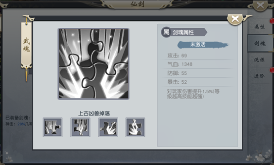 玩家通过收集剑魂碎片来激活剑魂。剑魂本身附带属性值和剑魂技能,对玩家在PK、挑战BOSS、做任务、攻城战、仙盟战等活动方面的帮助都有不小的提升!