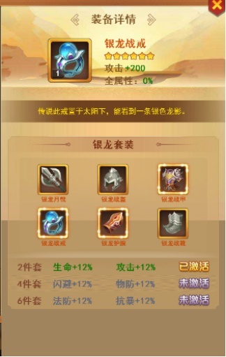 那么度过了前期装备的选择,那么中期的6星橙装的选择肯定有困惑大批的小伙伴们,那么小编就继续说道说道,橙装又分银龙套装、紫金套装、乌金套装、霸王套、赤焰套以及明光套,那么这边就推荐银龙套或者紫金套装。