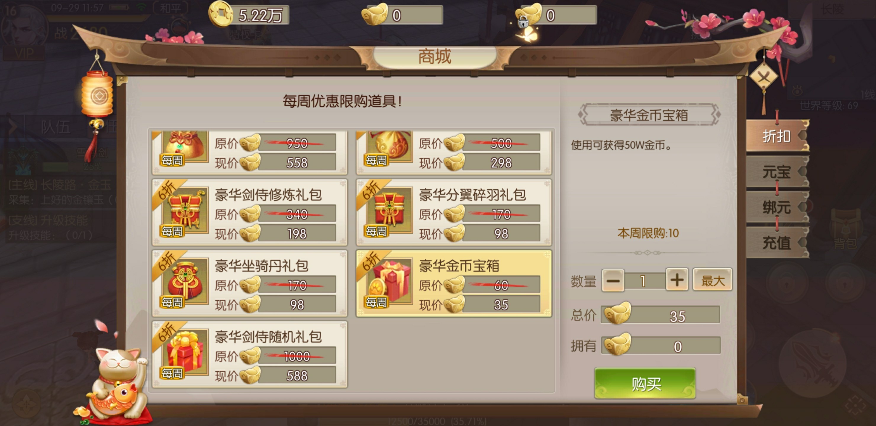 如果少侠实在是短缺金币,也可以选择购买商城中的豪华金币宝箱,使用后直接获得50万金币,当前还在打折哦。只要35元宝,不过需要注意每周限购10次哦。每日直充3/6/8元小额礼包,还可获得高达10倍返利的金币礼包哟。