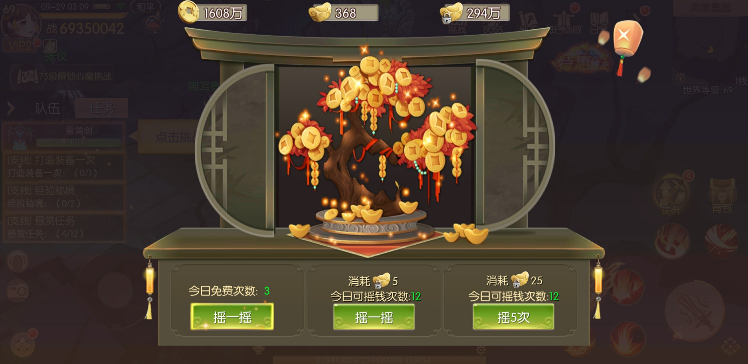 要说游戏中最方便的获取金币方法,就不得不提摇钱树玩法,只要点进去摇一摇就能不费吹灰之力得到金币。不过此玩法每日只向少侠提供3次机会,之间还有冷却时间。每次摇钱会有5万金币奖励,不花钱可以得到15万金币。当然少侠也可以消耗绑元进行摇钱,每天会有10次绑元摇钱机会,提升VIP可以增加次数,金币收入十分丰厚。