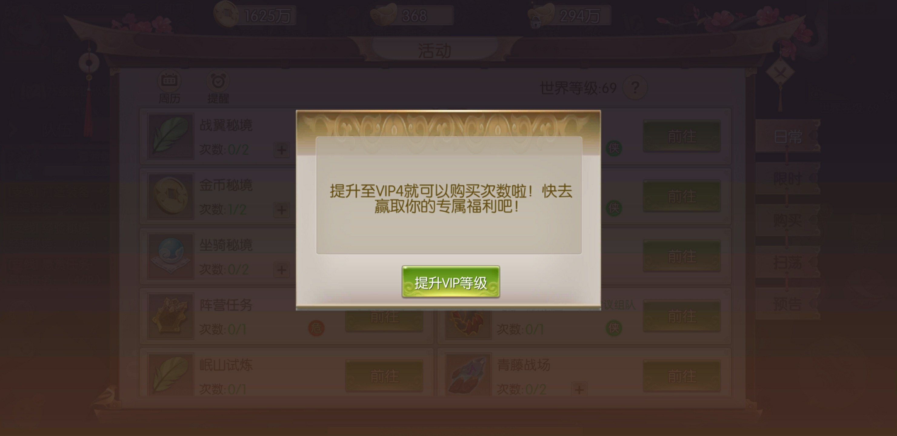 若是少侠觉得每日免费金币活动不够日常消耗的话,不妨小氪一点保证需求。根据vip的等级不同,每日会有不同的金币礼包赠送。比如达到VIP4就有每天多一次金币秘境进入次数,相当于多40多万金币,是不容小觑的。另外VIP等级还能开启扫荡功能和增加摇钱树次数,每多一次就能多得到5万金币,总得来说金币获取会有很大提升。还有组队副本只要达到VIP2就可以花50绑元购买收益次数,每购买一次就多5万金币收入。既能得到更多金币还有其他道具奖励,性价比蛮高。