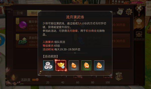 例如每周三第一个活动任务便是流月演武场。流月演武场的核心玩法是3V3实时对战,玩家可以与好友自行组队,亦可随机匹配队友。双方会师演武场展开最纯粹的PK,率先获得10次击杀的队伍便可取胜。