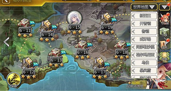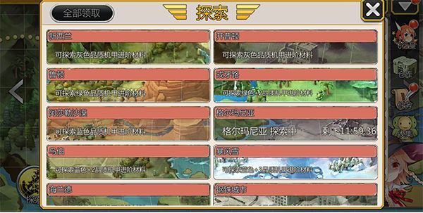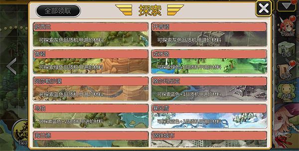 用户点击世界地图,在自己已经通关的地图的左下角有探索功能。用户可以点击看到各个通关副本,并显示探索他们获得的机甲进化材料。