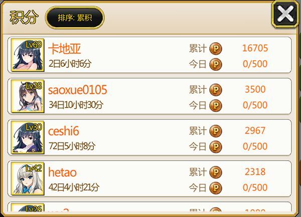 积分用户通过消耗自己的体力来获得,积分分为累计排行榜跟今日排行榜,方便联盟成员了解其他成员的情况。