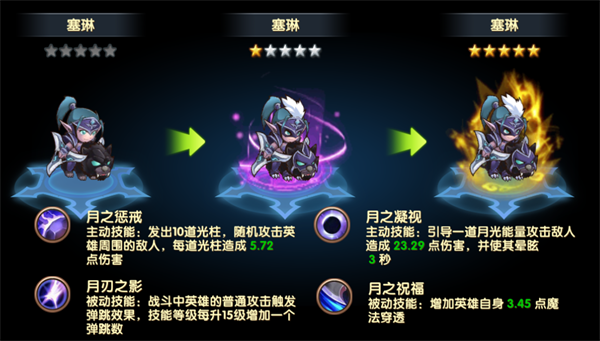【英雄立绘】每位英雄都可以切换形象哦 【英雄升阶及技能介绍】 【登场台词】愿月光照耀你的道路! 【死亡台词】今晚的月光真美。。。 【英雄定位】中后排DPS 赛灵儿是前期赠送的三英雄之一,高..