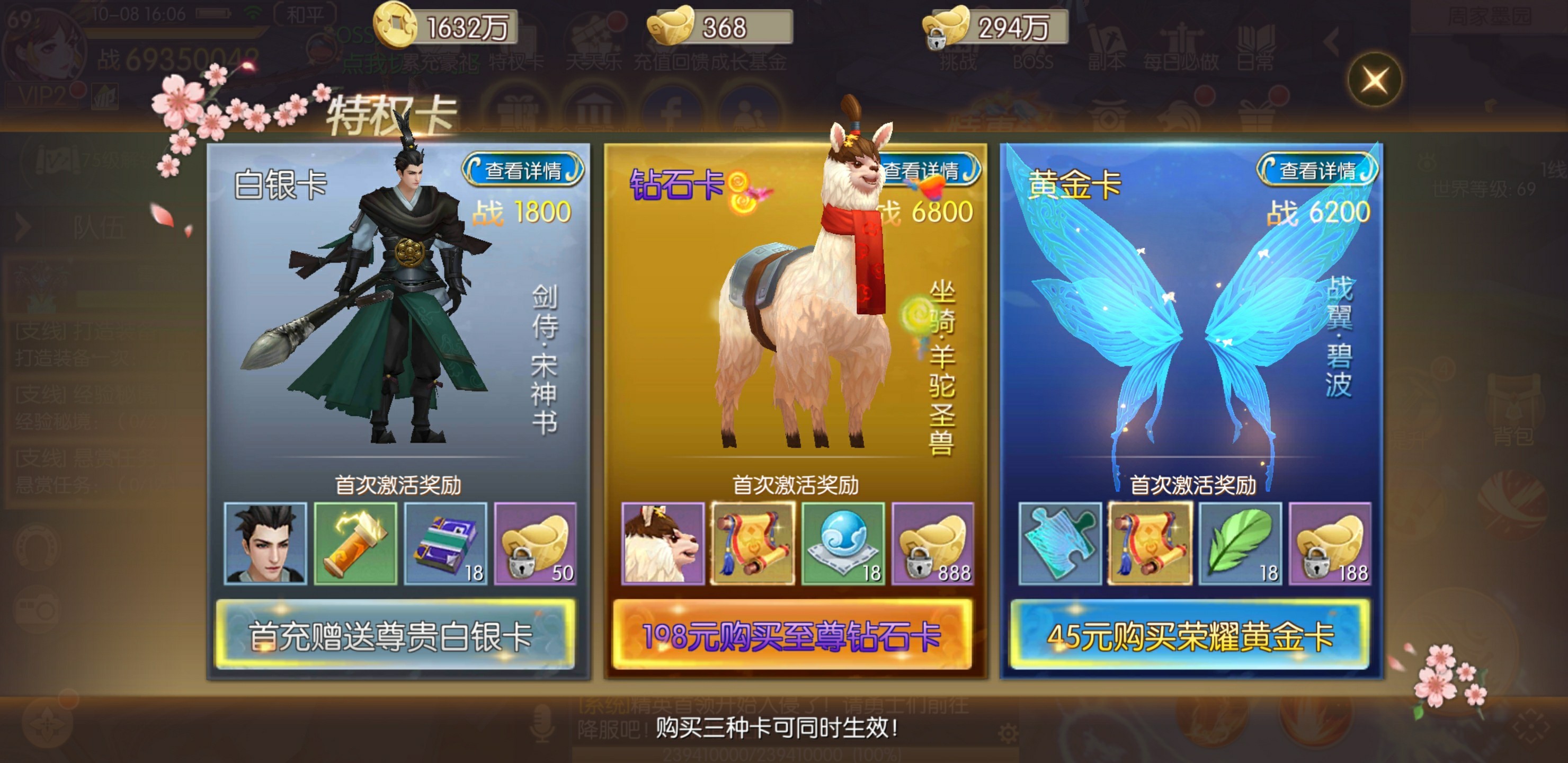 特权卡属于第二个必投方向,长期的回报值较高。单笔的游戏元宝充值虽说爽快,在长期回报的方面,确实比不过提高回报率及拥有专属特权的特权卡。至于特权卡的三个类型,推荐初期使用钻石卡,中期转成黄金卡或者白银卡。在前期用钻石卡将等级战力拉开,中后期黄金卡、白银卡才能起到最大收益值。当然了,有能力的话三个特权卡都开最佳,考虑到微氪的前提,还是仁者见仁。