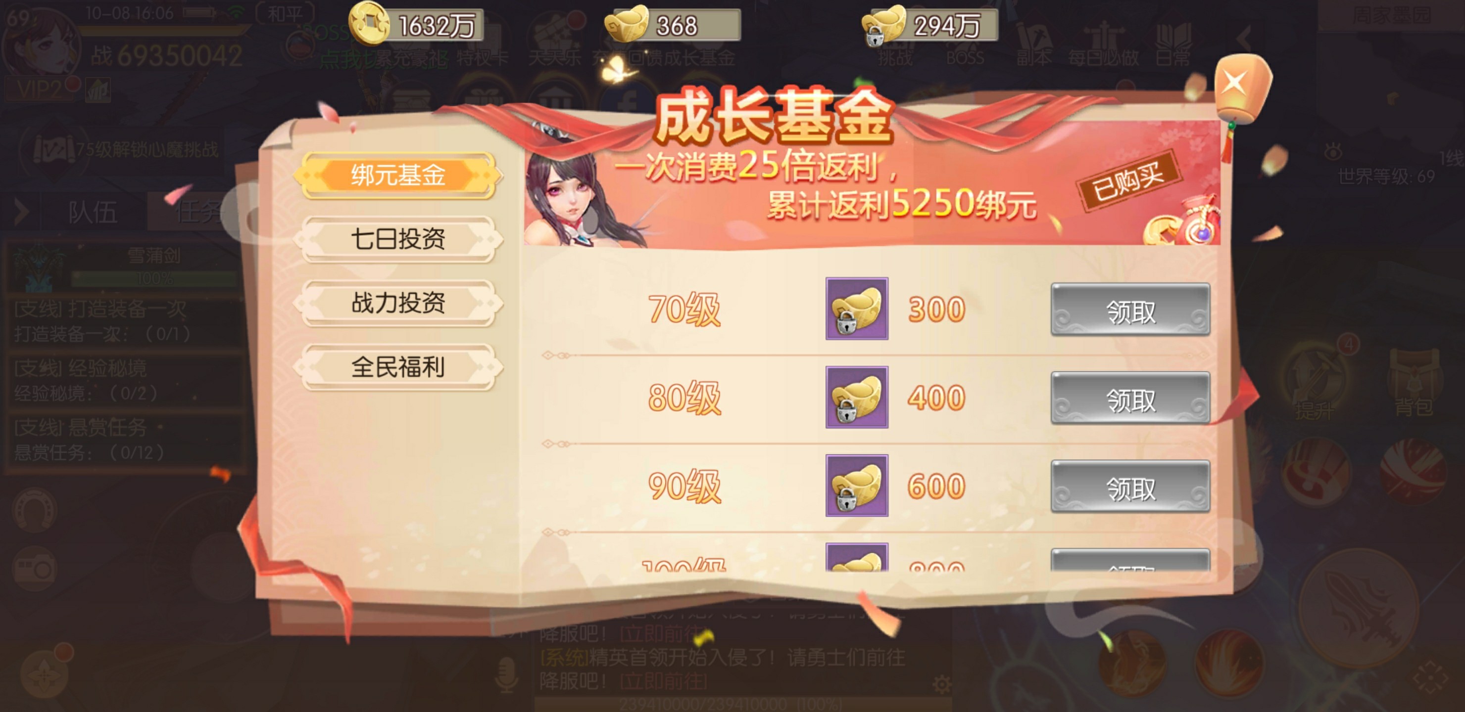 游戏中,成长基金总共分为四个方面:绑元基金仅需198元宝(19.8元)、七日投资花费498元宝(49.8元)购买、战力投资也只需498元宝(49.8元)、全民福利则是免费。其中购买绑元基金后能获得5250绑元奖励(525元),返利整整25倍;七日投资可获得3500绑元(350元);战力投资可获得7000绑元(700元);全民福利可获得600绑元(60元)。回报虽多,还是提醒各位,绑元返需要达到指定等级后领取哦。