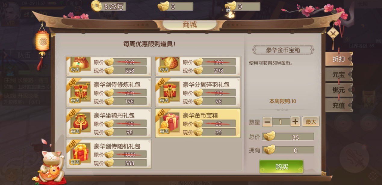 金币作为贯穿整个游戏的硬通货(当然绑元与元宝也能兑换),几乎在各方面都有需求。个人推荐购买摇钱树次数和金币礼盒,摇钱树一天能产出50万金币以上,礼盒一次能开出50万,这两个途径的金币来得又快又方便。金币充足的情况下,建议少侠购买炼阵石、宝石、技能提升材料与洗练材料。