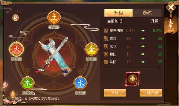 器灵系统是一个偏后期的一个系统,对自身属性和战力的加成都很大,各位看官老爷们赶快进入游戏把你的器灵升级到25级吧!既能得到属性和战力的加成,又能解锁炫酷的特效何乐而不为呢!