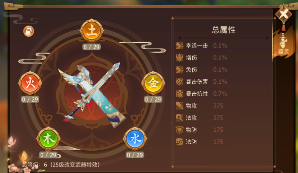 器灵系统中有五种灵魄,也就是五行中的金木水火土,每一种灵魄都对应着一个特有的属性加成。