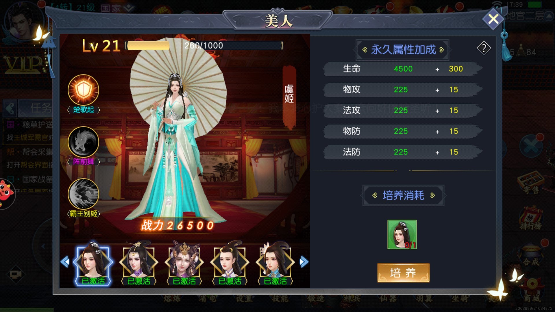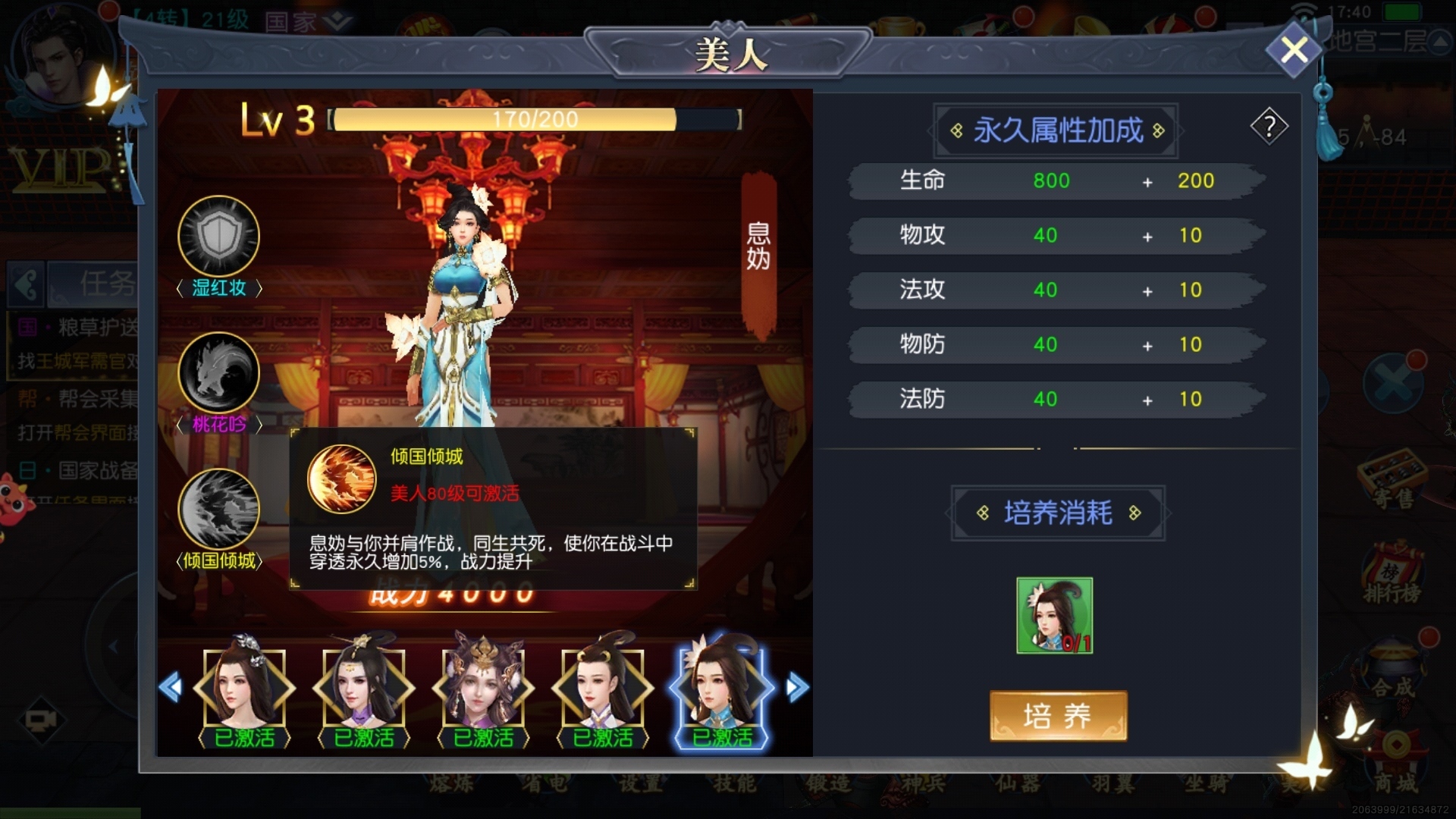 2、培养后提升各美人枭雄等级,对应属性提升,提升角色战力